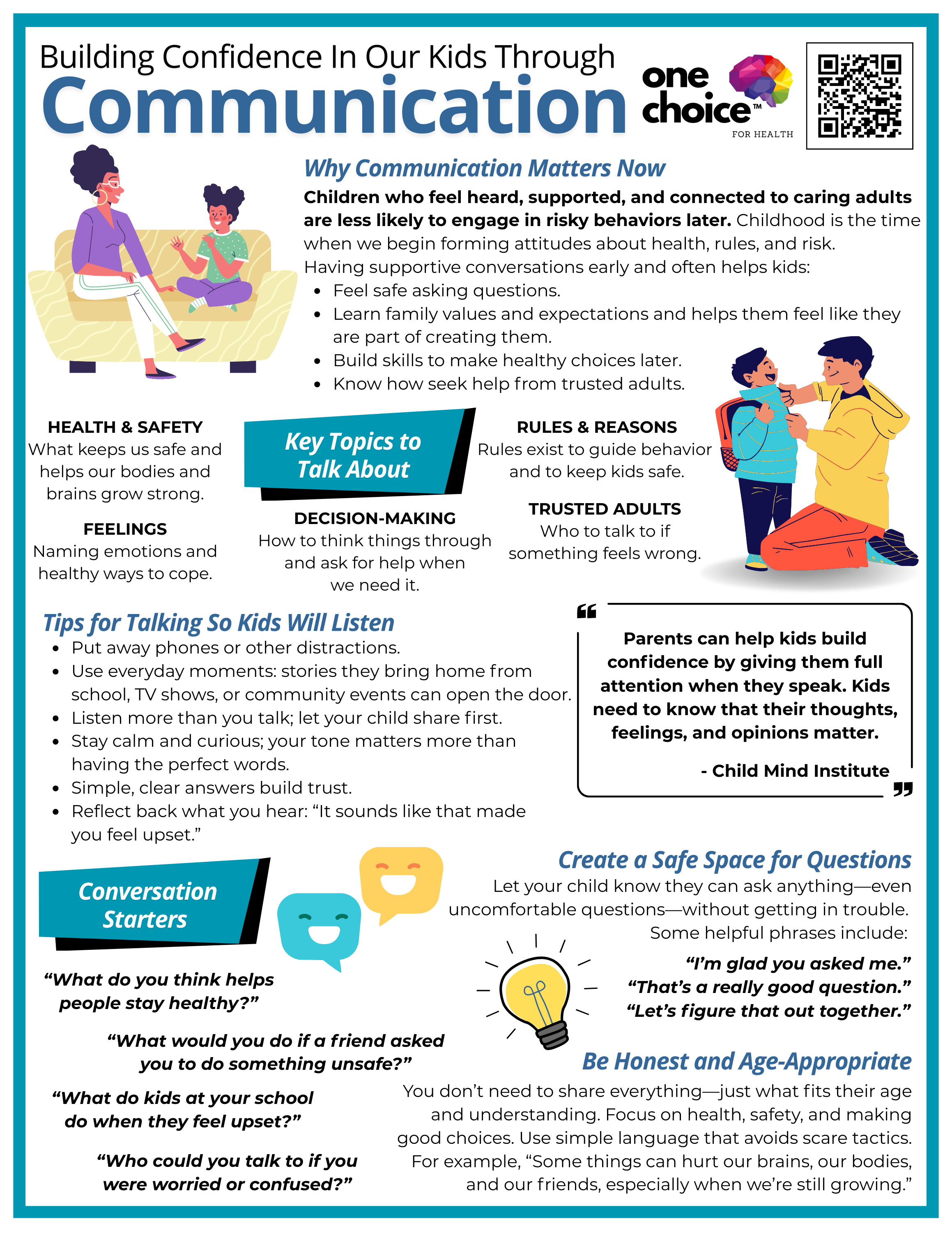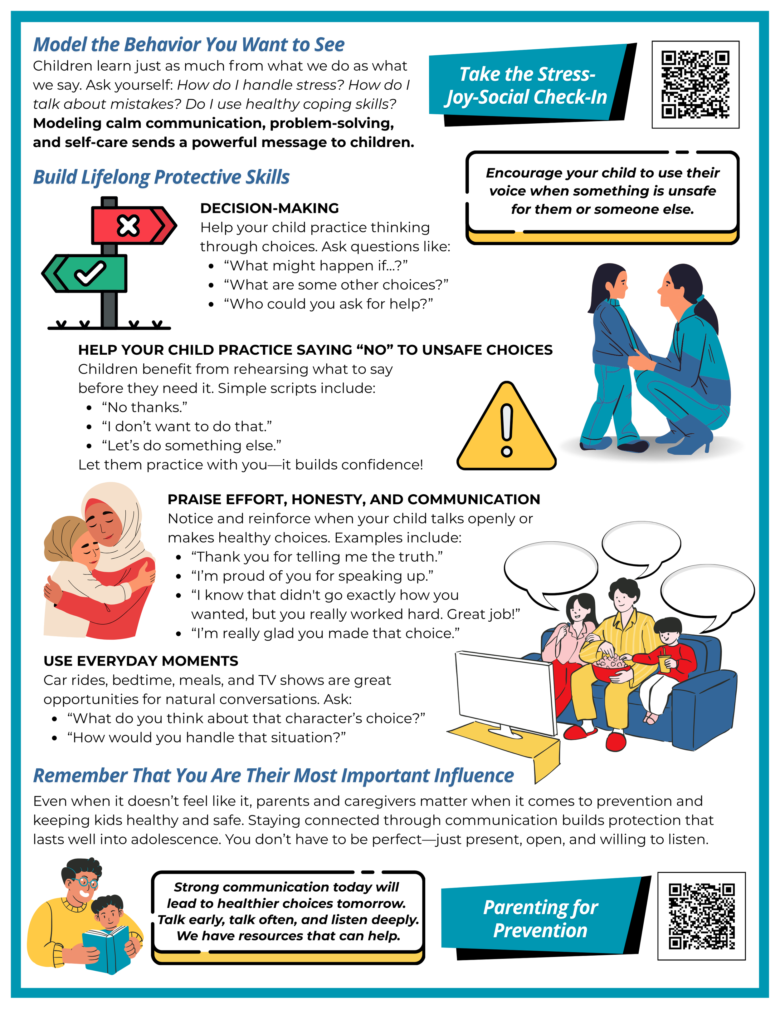 Children who feel heard, supported, and connected to caring adults are less likely to engage in risky behaviors later. Childhood is the time when we begin forming attitudes about health, rules, and risk — this handout offers communication tips and conversation starters.